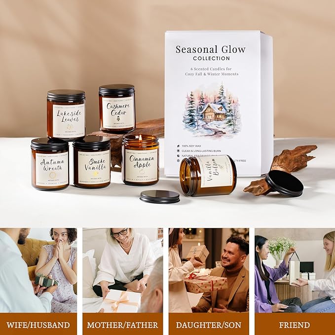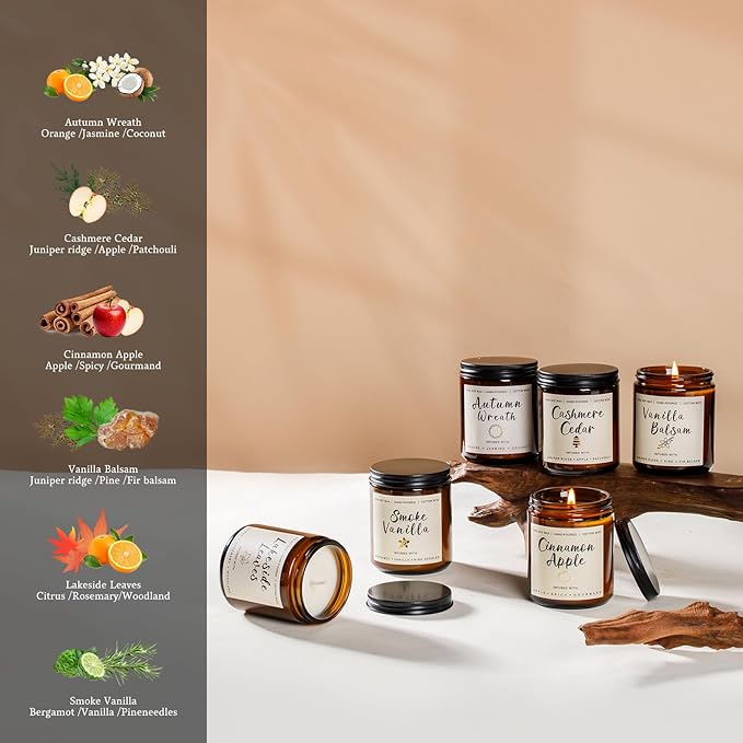 - Perfect Fall Candles Gift Set: Celebrate the cozy season with this 6-pack scented candle set, including Cinnamon Apple, Autumn Wreath, Vanilla Balsam, Lakeside Leaves, Cashmere Cedar, Smoke Vanilla. A thoughtful autumn candle gift for women, moms, teachers, or anyone who loves fall!