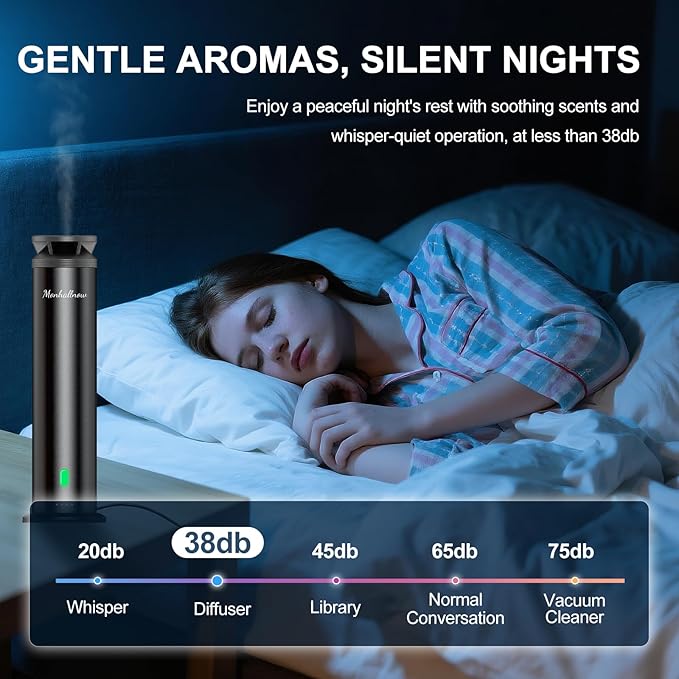 • Effortless Operation & Smart Control: This premium waterless diffuser offers intuitive button and remote functions for easy use. Set 1, 4, or 8-hour timers and choose from six scent intensity levels to personalize your aromatherapy—from cozy bedrooms to large rooms—with minimal effort