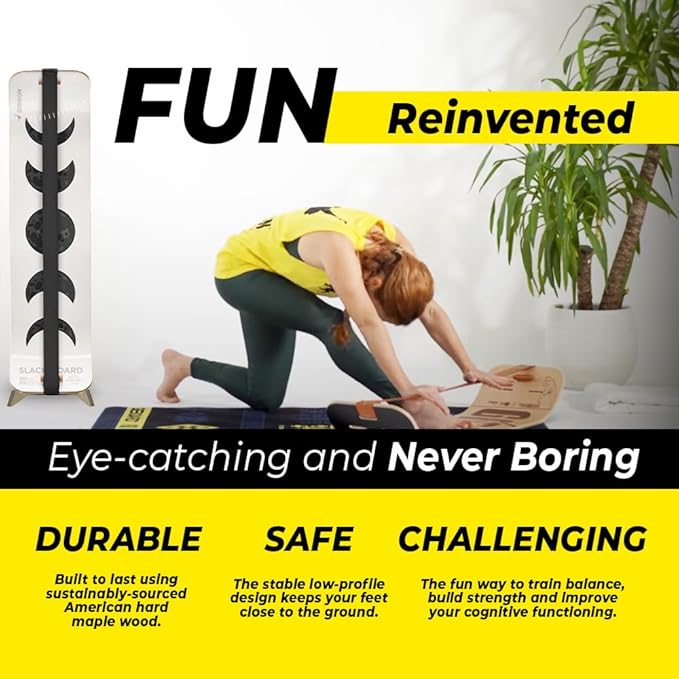 - THE ENHANCED BALANCING BOARD BUNDLE: Elevate your fitness routine with this modern balance board, designed for both adults & kids. The SlackBoard has a minimalist, compact, and lightweight structure, it’s perfect for core strengthening, practicing freestyle tricks, and basic balancing. This kit comes with a stand accessory that’s a perfect fit, adding stability and functionality to your workouts, seamlessly integrating your wobble balance board into your home decor when your session is finished.