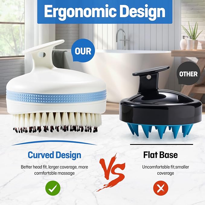- 【Curved Design,Better Head Fit】 Most head massage brushes on the market have flat bases for their bristles. Our scalp massager features long rounded nylon bristles and fine nylon filaments set on a curved base that conforms better to the head. It covers a larger area during scalp massage, provides a more comfortable massage experience, and become a more efficient shampoo brush and scalp massage tool.