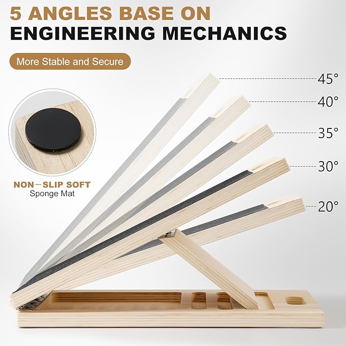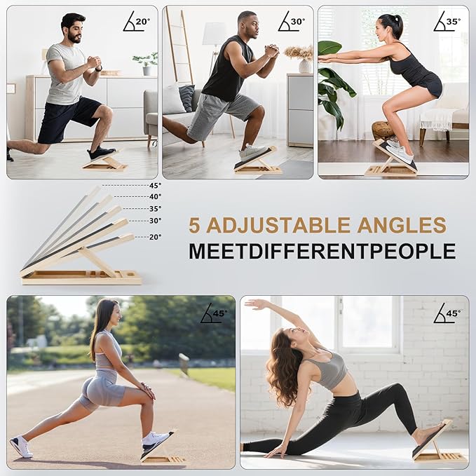 - 5 Adjustable Angle Wooden Slant Boards: Adjustable to 5 positions: 20 °, 30 °, 35 °, 40 °, 45 ° Slant Boards, easy to carry, suitable for stretching and weight-bearing exercises at home, office, gym, and clinic. Choose different degrees of calf extension from easy to difficult, adding diversity and challenge to exercise plans.
