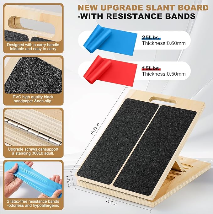 - Newly upgraded slant boards for exercise: This calf stretcher is made of 11 layers of high-quality poplar wood core and weighs only 4.5 pounds. The upgraded screws can support adult standing up to 300 pounds. The anti slip EVA base and PVC sandpaper surface can prevent slipping when the calf is stretched or squatting. In addition, it is equipped with two types of TPE materials and latex free physical therapy straps to meet more exercise needs.